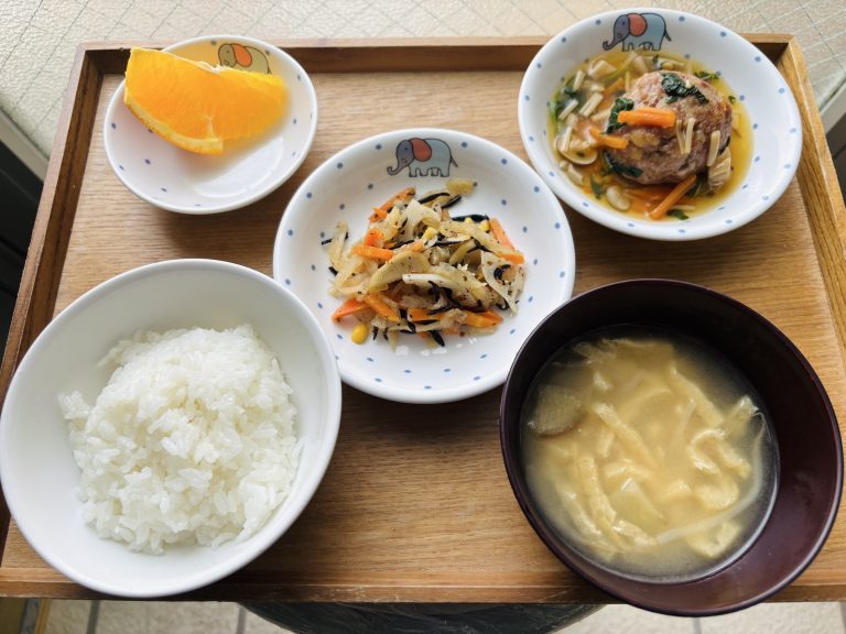 ・ご飯・和風ハンバーグ・根菜ひじきサラダ・味噌汁・オレンジ