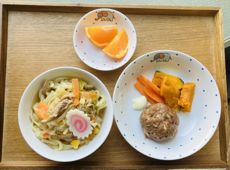 ・ラーメン・餃子の中身バーグ・蒸し野菜・オレンジ