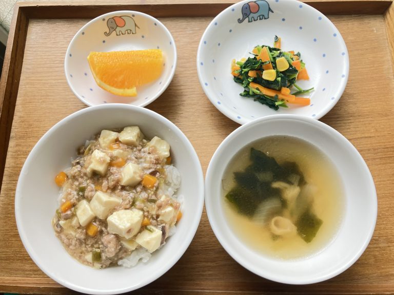 ・麻婆豆腐丼・ほうれん草のソテー・中華スープ・オレンジ