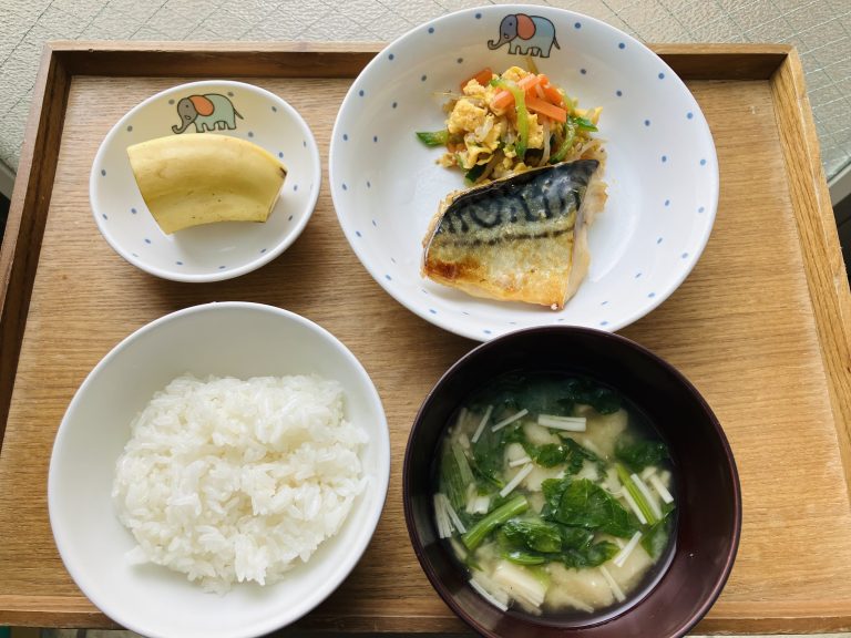 ・ご飯・鯖の醤油麹焼き・もやしの彩和え・味噌汁・バナナ
