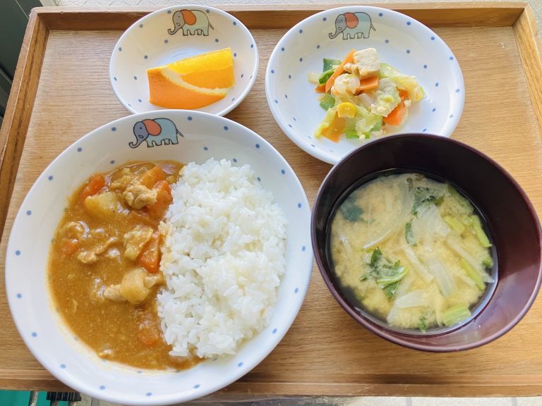 ・和風ポークカレーライス・豆腐サラダ・味噌汁・オレンジ