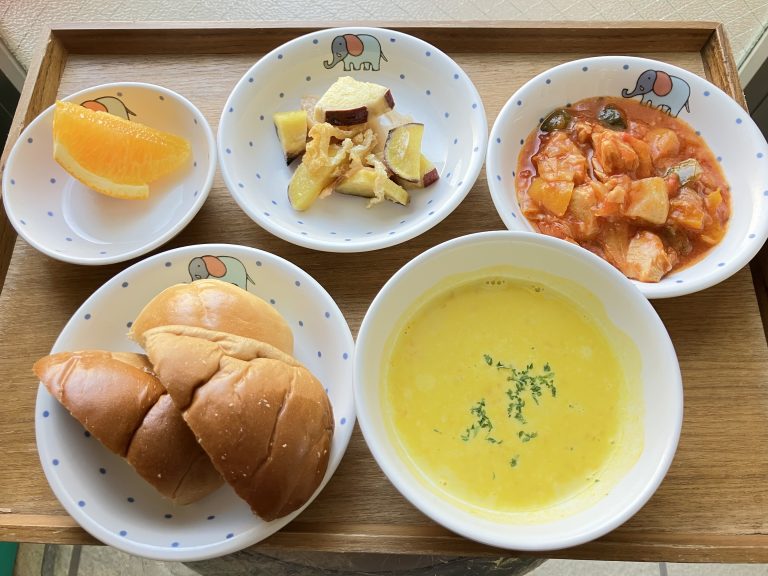 ・黒糖ロールパン・鶏肉のトマト煮・焼き野菜のマリネ・かぼちゃスープ・オレンジ