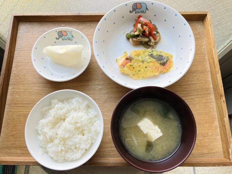 ・プラスご飯・鮭のコーンマヨ焼き・茄子の炒め煮・味噌汁・梨
