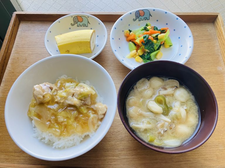 ・鶏肉丼・青菜のおひたし・味噌汁・バナナ