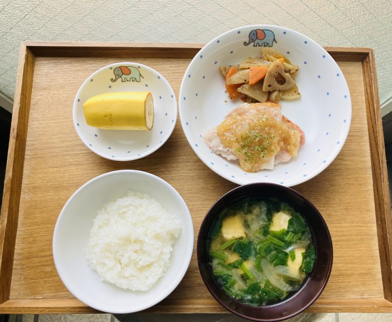 ・ご飯・豚肉のアップルソースかけ・根菜のきんぴら・味噌汁・バナナ