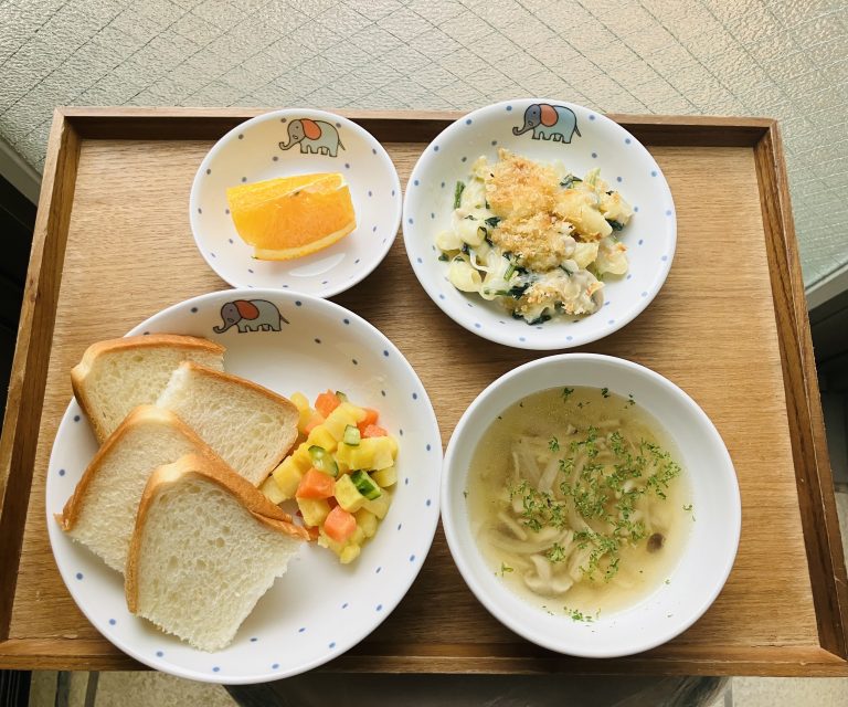 ・食パン・グラタン・マセドアンサラダ・キノコスープ・オレンジ