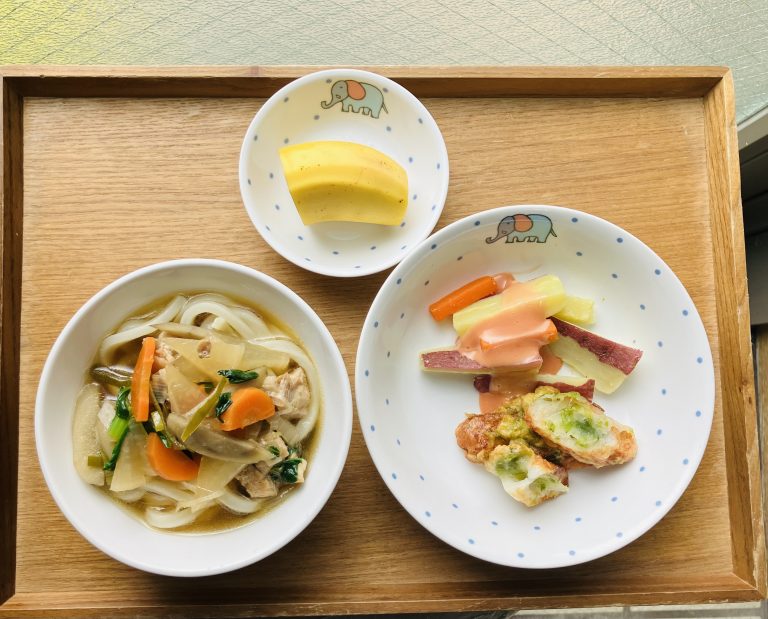 ・けんちんうどん・ちくわの磯辺焼き・温野菜サラダ・バナナ