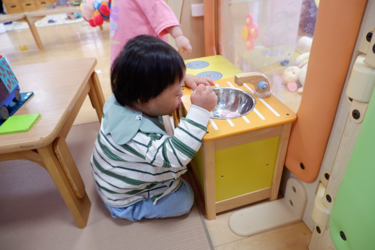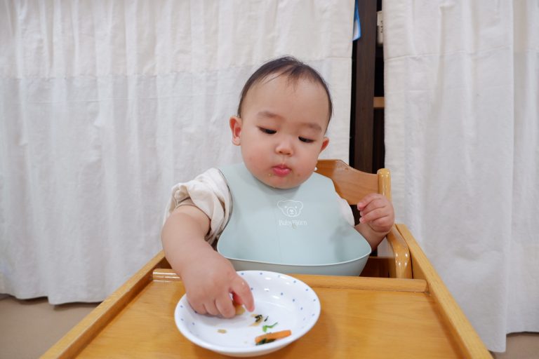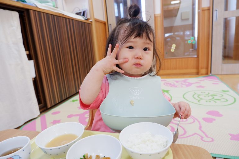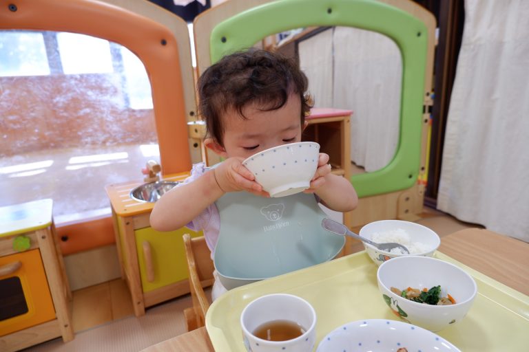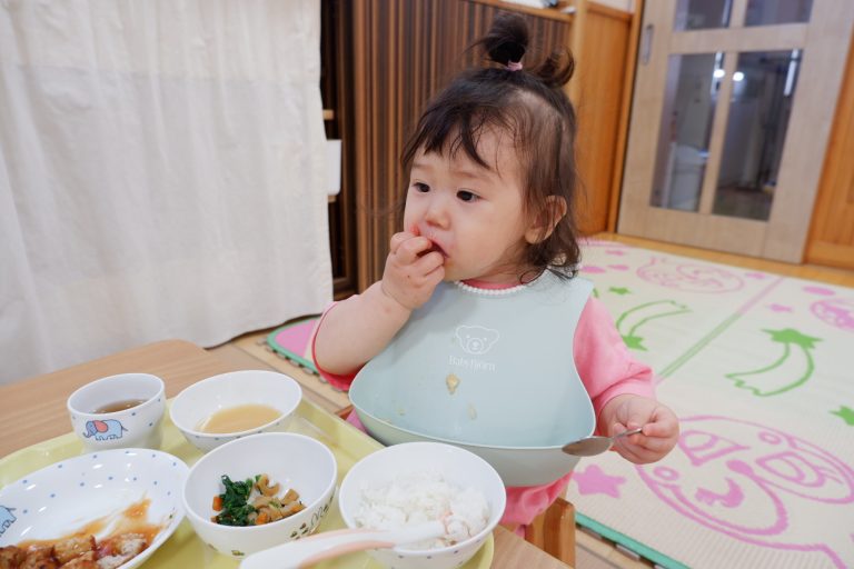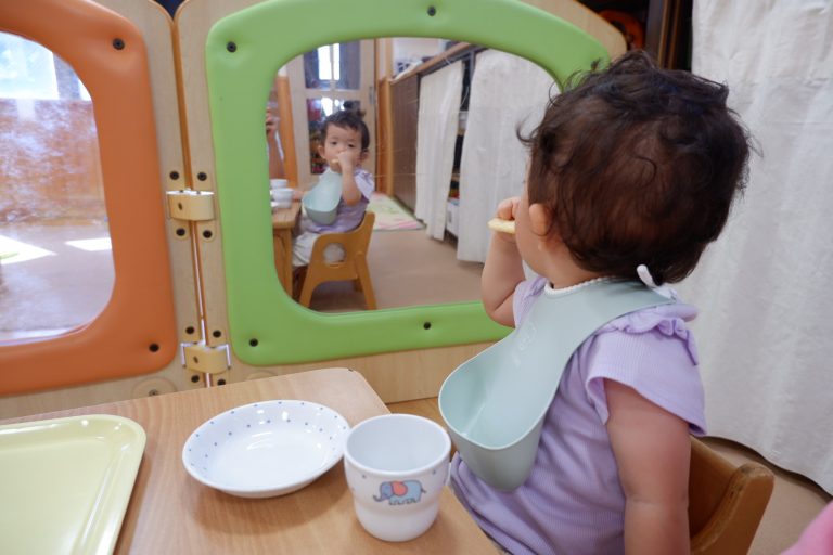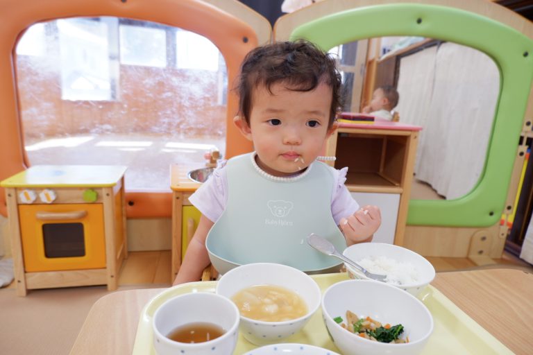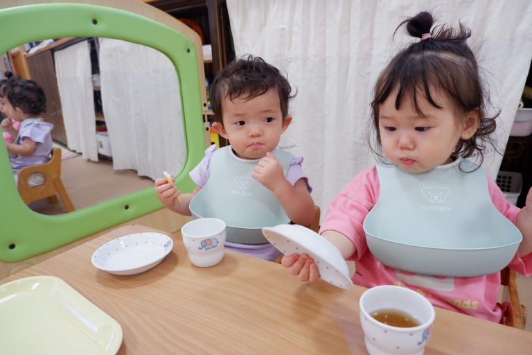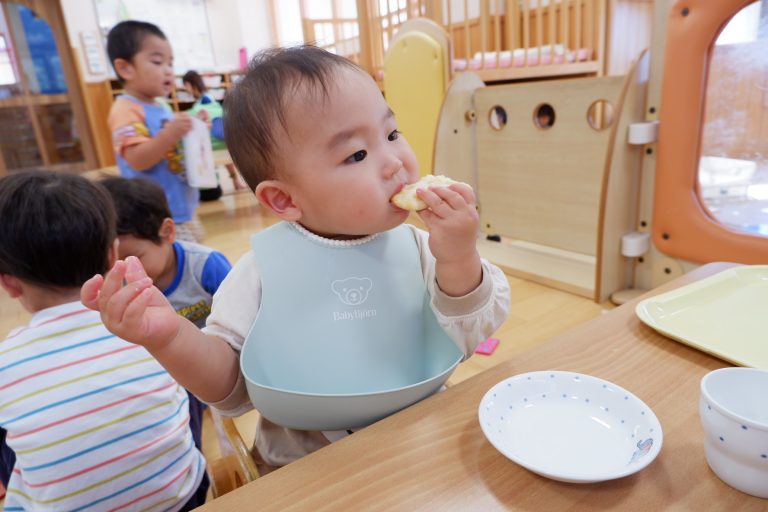 「おやつの時間ですよ」と保育士が声をかけると、自分の足で机に向かってきてくれるひよこ組さん。