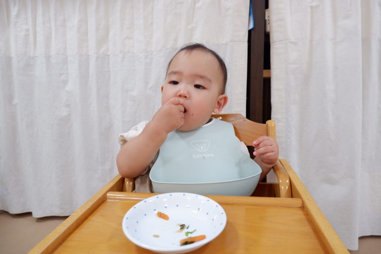 カートの中で、「まんま、まんま」と言いながら給食を心待ちにしているひよこさん。