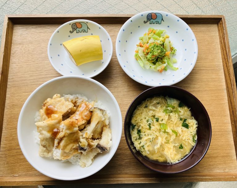 ・カジキの蒲焼き丼・ブロッコリーのごま酢和え・味噌汁・バナナ