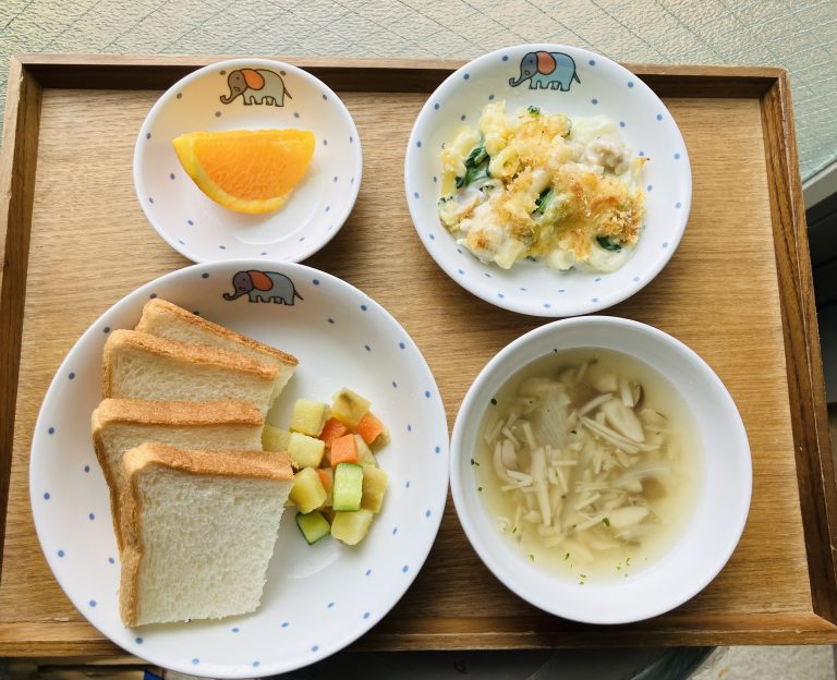 ・食パン・マカロニグラタン・マセドアンサラダ・きのこスープ・オレンジ