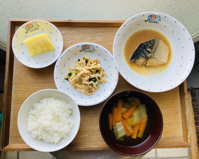 ・ご飯・鯖の味噌煮・大根のおかか和え・すまし汁・パイナップル