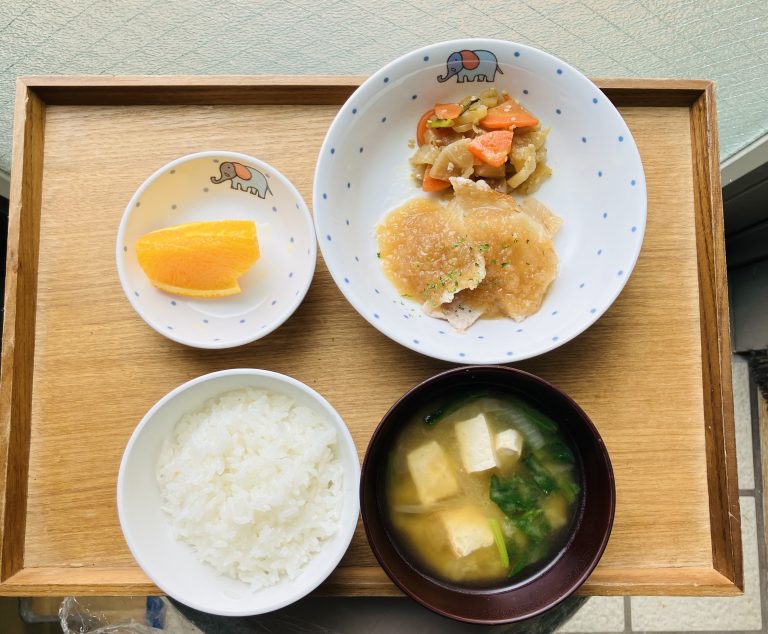 ・ご飯・豚肉のアップルソースかけ・根菜のきんぴら・味噌汁・オレンジ