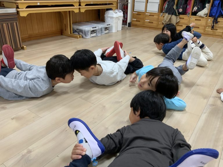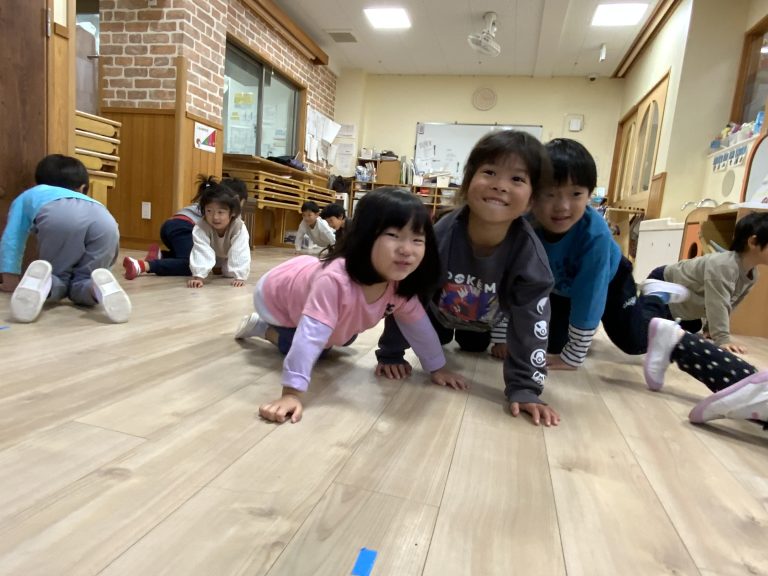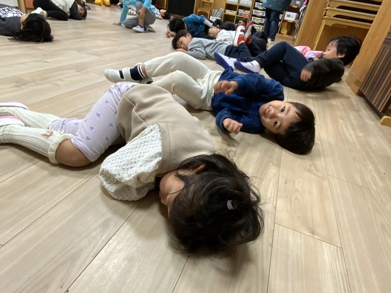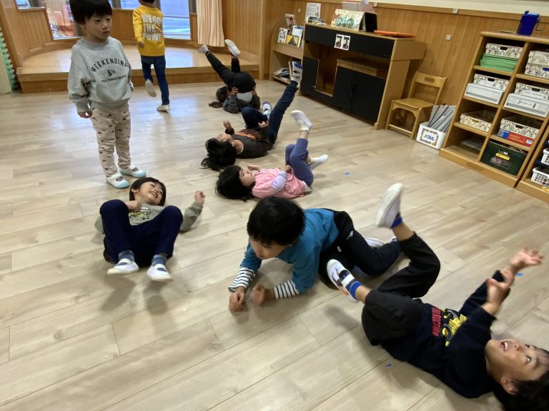 音楽に合わせて動物や虫に変身します。何度も回数を重ねると、種類ごとに聞き分ける反応も早くなってきました。最近、仰向けになり脚だけ動かす「自転車漕ぎ」の動作が加わり、さらに楽しんで身体を動かしています。
