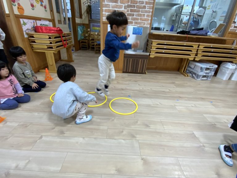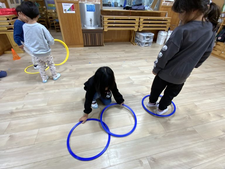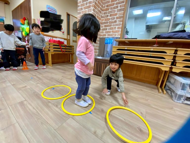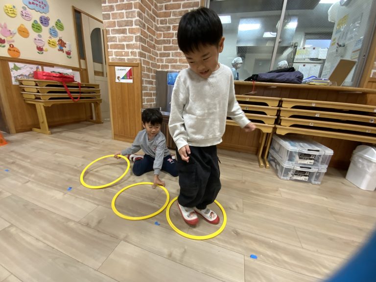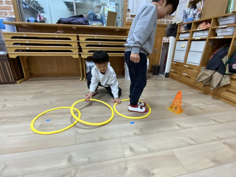 ペアになりフープを動かす子と、前に進む子の役割を決めます。フープの中だけ立つことができ、ふたりで協力してどんどん進んでいき、チームで競争をしました。
