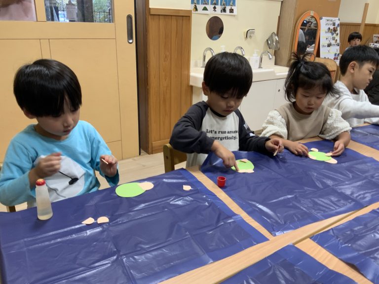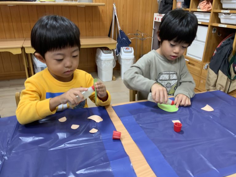 雨天の日は、リズム運動やゲームをして身体を動かしたり、製作をして過ごしています。