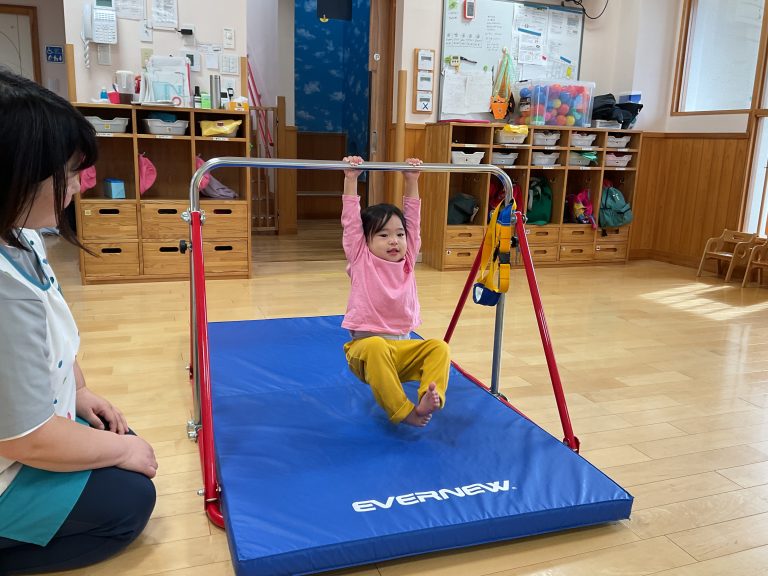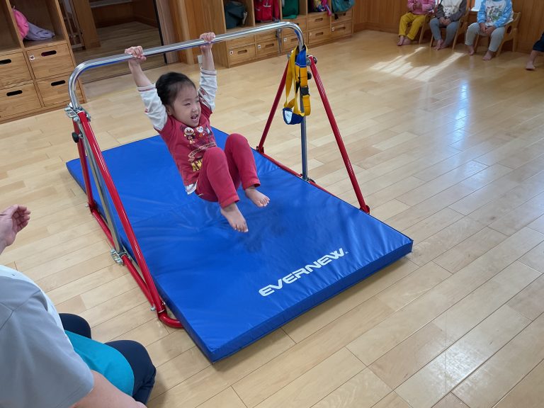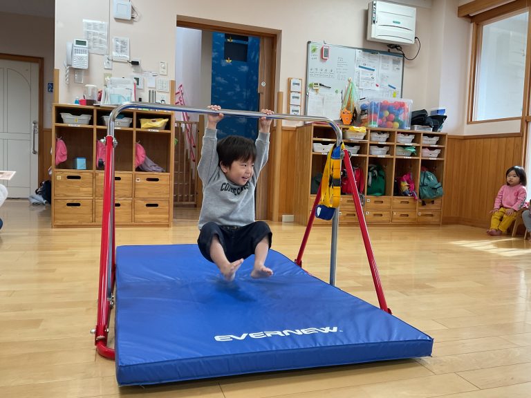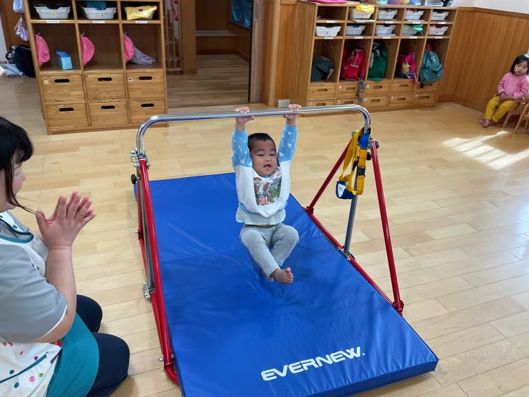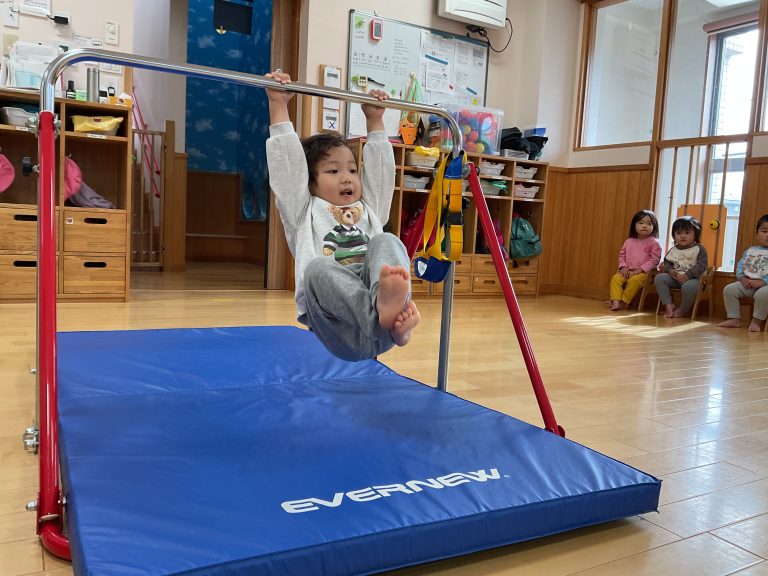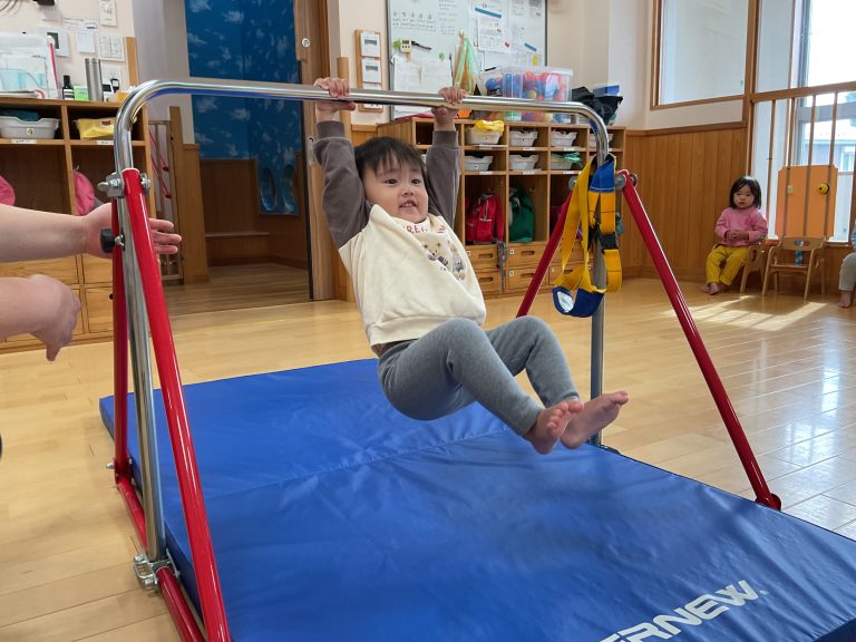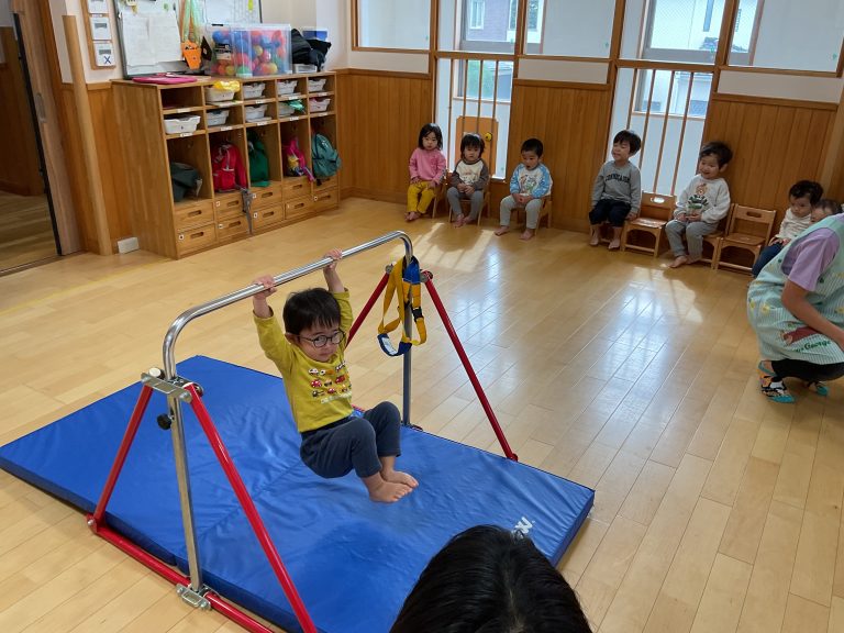 次に、鉄棒をしました。うさぎ組のお友達は、鉄棒を持つ手の力がしっかりしています!!