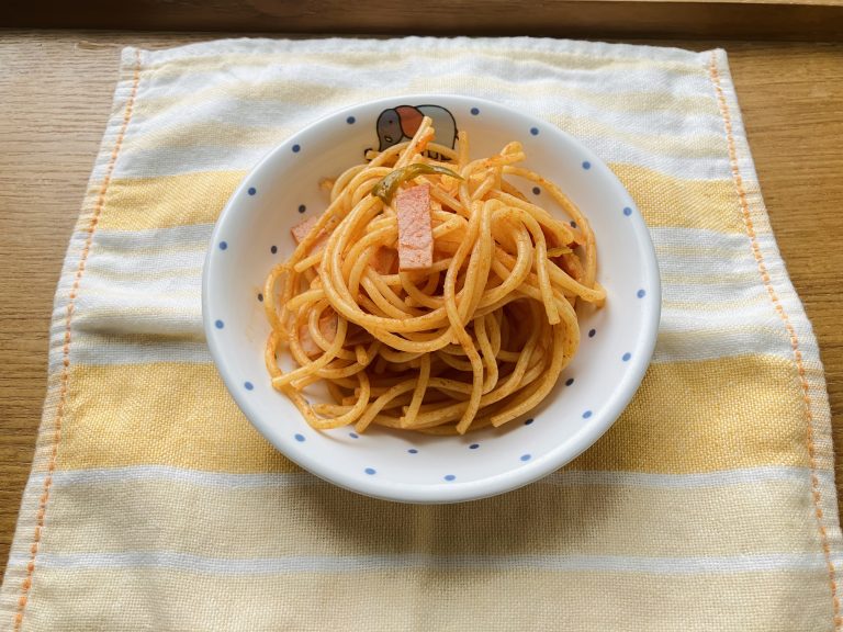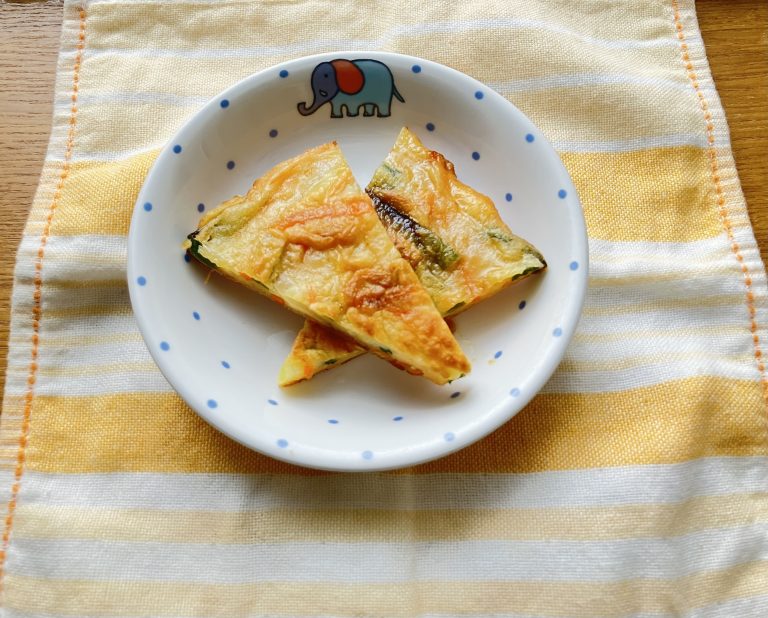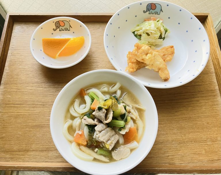 ・野菜つゆうどん・とり天風・キャベツの胡麻マヨ和え・オレンジ