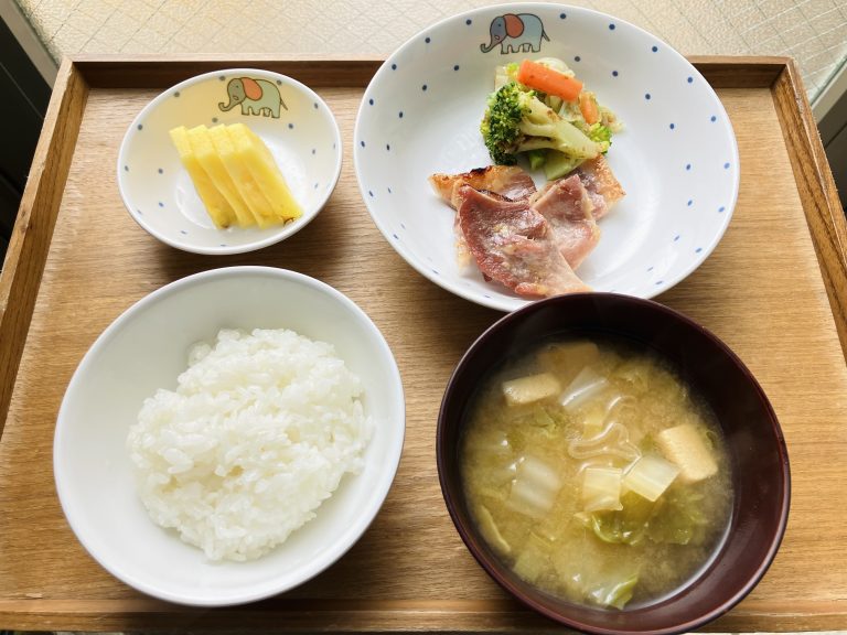 ・プラスご飯・豚肉の醤油麹焼き・ブロッコリーのおかか和え・味噌汁・パイナップル
