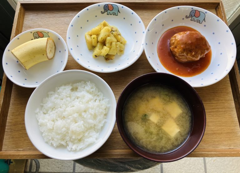 ・ご飯・レバー入り煮込みハンバーグ・じゃが芋のサブジ・味噌汁・バナナ