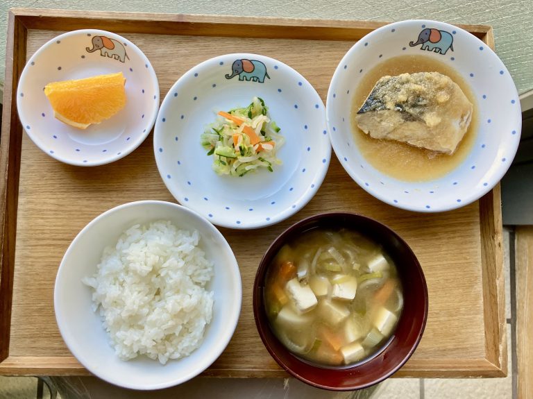 ・ご飯・鯖のおろし煮・三色酢の物・味噌けんちん汁・オレンジ
