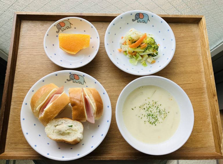 ・ハムチーズサンド・ツナポテトサンド・花野菜サラダ・豆乳コーンポタージュ・オレンジ