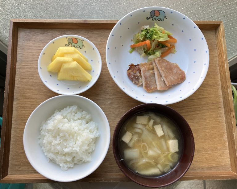 ・プラスご飯・豚肉の醤油麹焼き・ブロッコリーのおかか和え・味噌汁・パイナップル