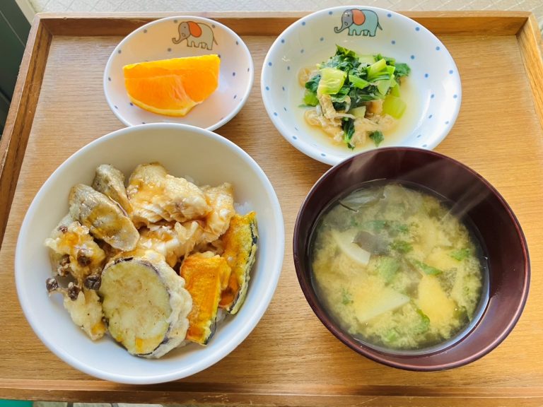天丼・しらすと青菜の炒め煮・味噌汁・バナナ