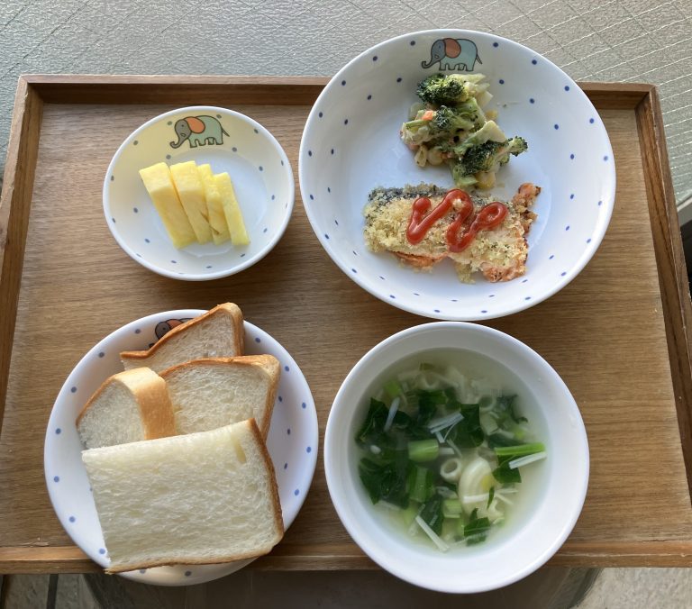 ・食パン・鮭のミラノ風カツレツ・オーロラサラダ・マカロニスープ・パイナップル