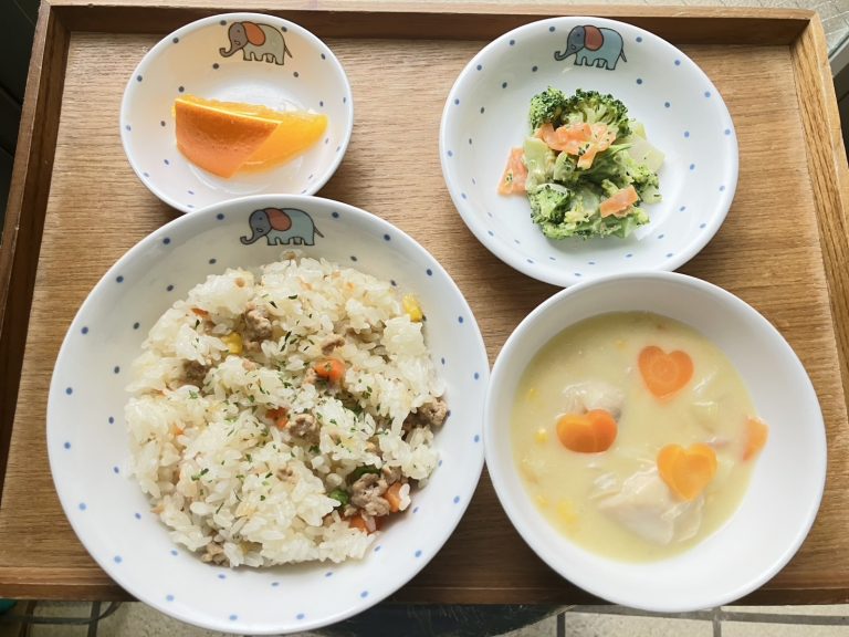 カラフルピラフ・ブロッコリーのオーロラ和え・クリームシチュー・オレンジ