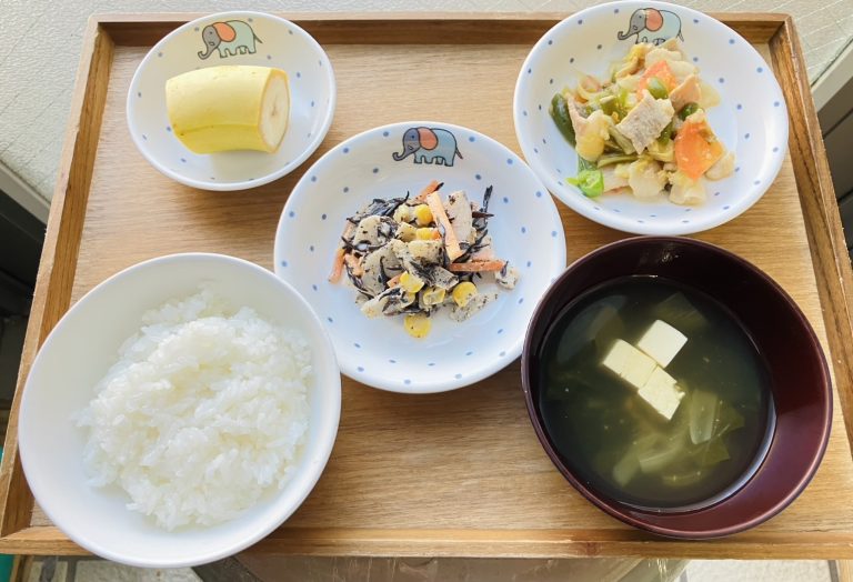 ごはん・豚肉とキャベツのみそ炒め・根菜ひじきサラダ・すまし汁・バナナ