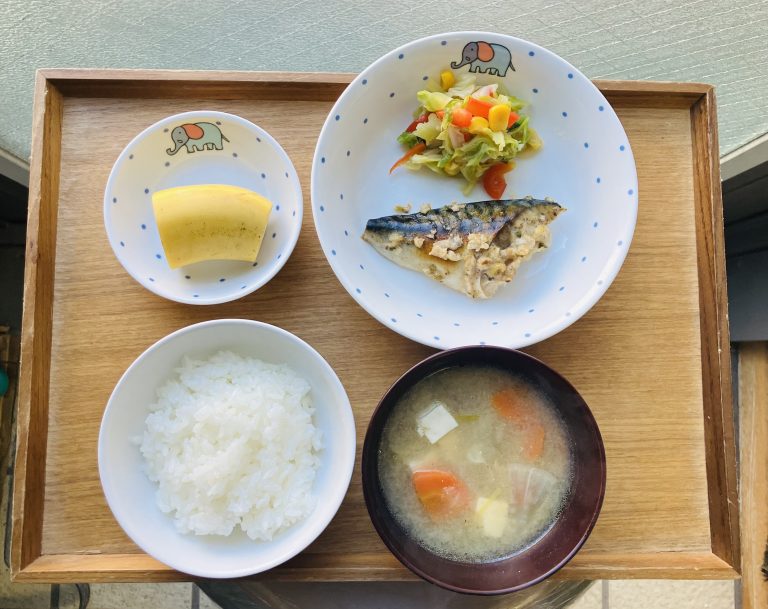 ・ご飯・鯖の梅焼き・キャベツの彩り炒め・味噌けんちん汁・バナナ