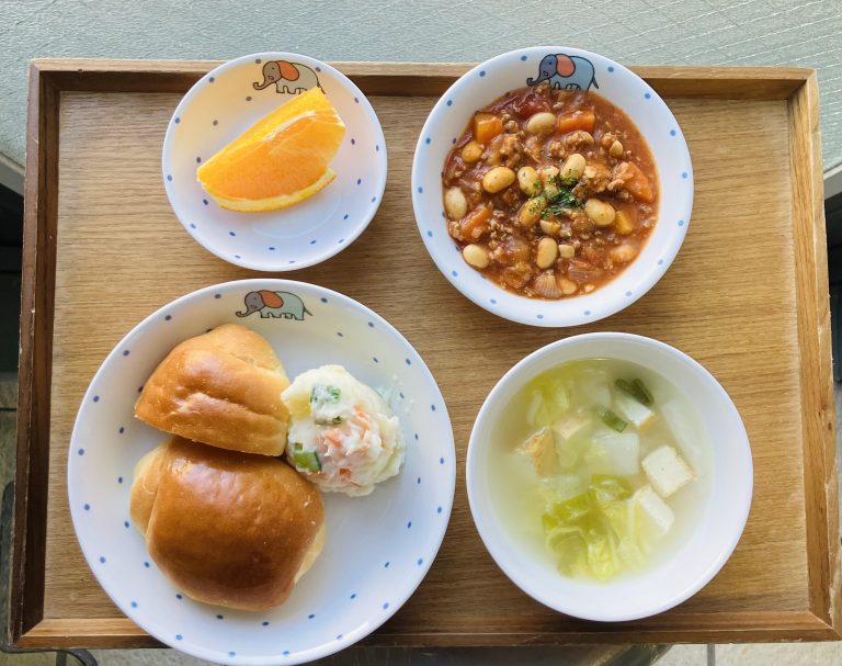 ・ロールパン・チリコンカン・ポテトサラダ・冬野菜のスープ・オレンジ