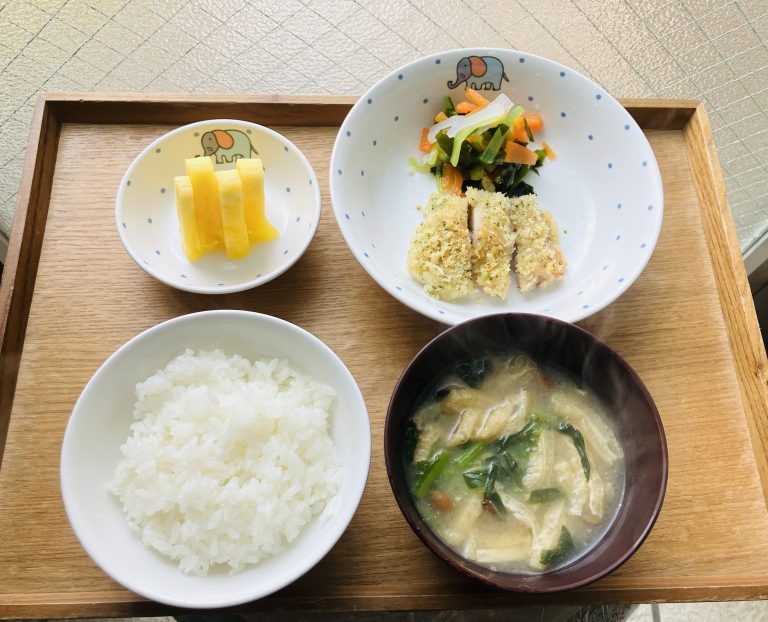 プラスご飯・鶏のチーズパン粉焼き・きゅうりとわかめの酢の物・味噌汁・パイナップル