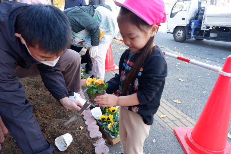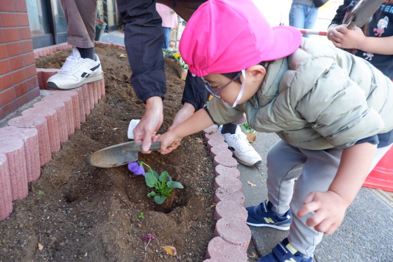 順番にシャベルをもらい、穴を掘っていき、好きな色のパンジーを選び、植えていきました。