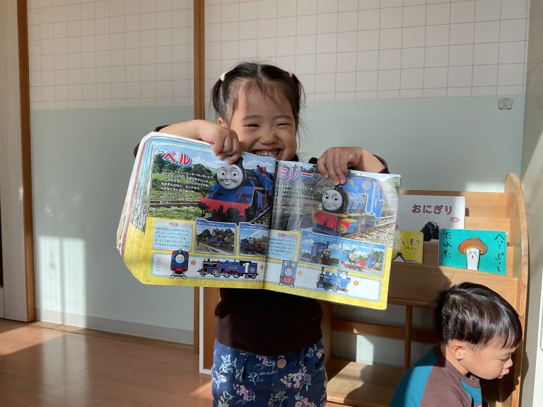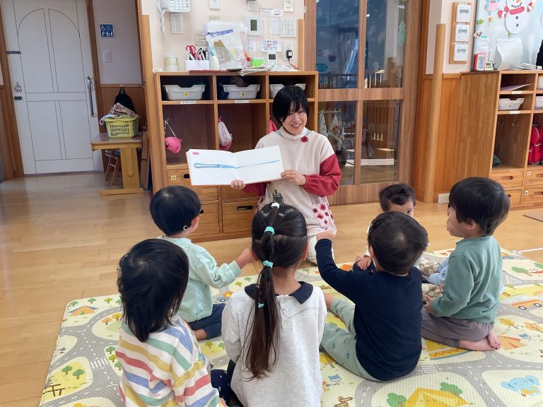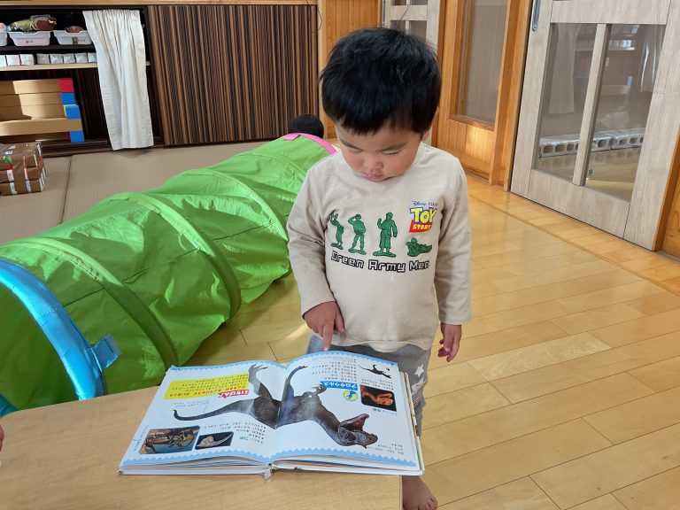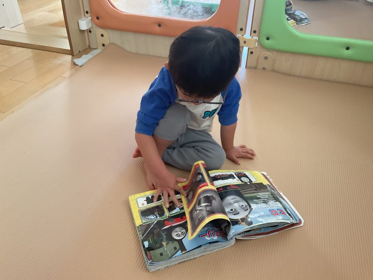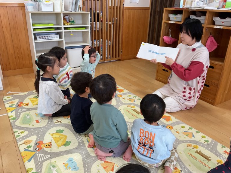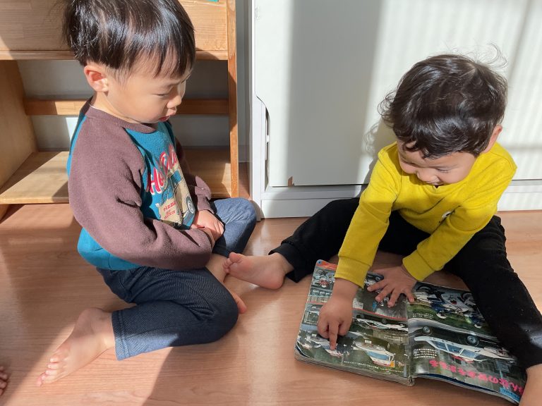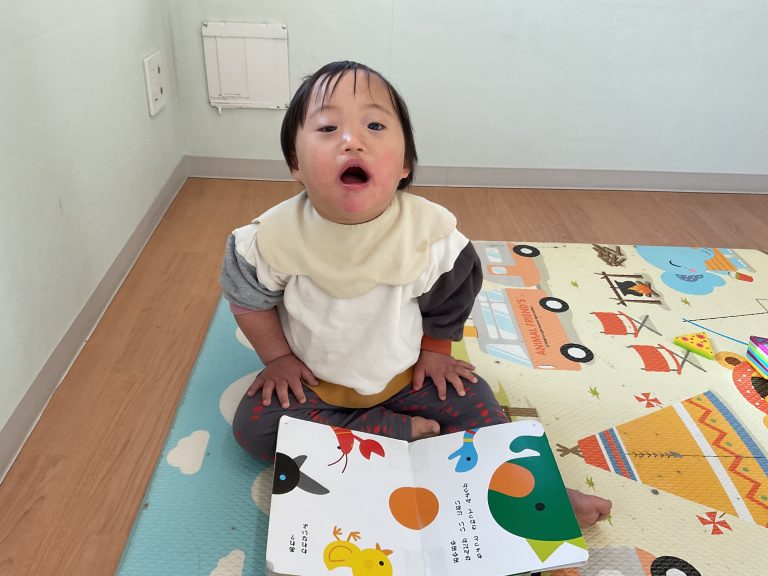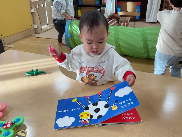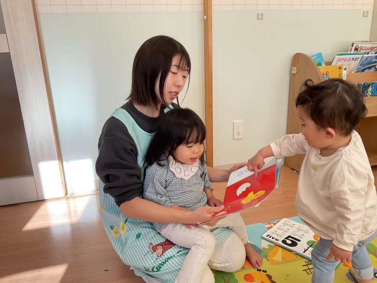 自分で絵本をパラパラめくったり、覚えているフレーズを声に出しながら楽しむ姿や、保育士の膝に座り、読んでもらう姿が多く見られます。ひよこ組さんも、お気に入りの絵本を持ち、「これ読んで!」と言い、保育士のところに来てくれています。
