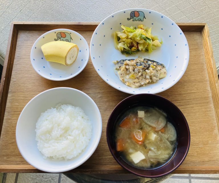 ・ご飯・鯖の梅味噌焼き・キャベツの彩り炒め・味噌けんちん汁・バナナ