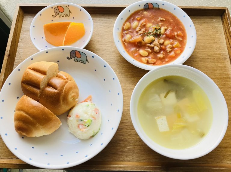 ・ロールパン・チリコンカーン・ポテトサラダ・冬野菜のスープ・オレンジ