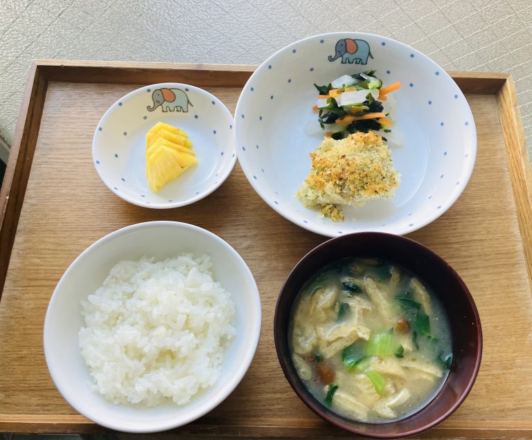 ・プラスご飯・鶏のチーズパン粉焼き・三色酢の物・味噌汁・パイナップル