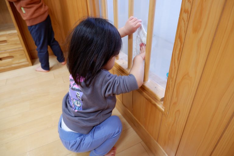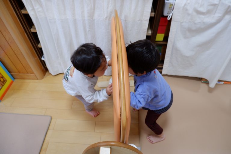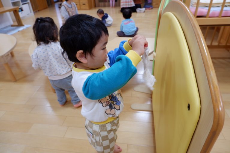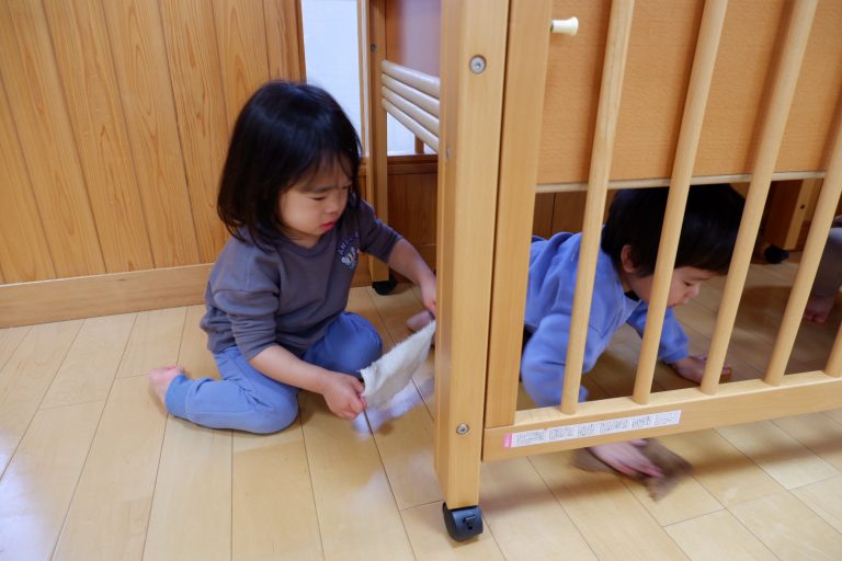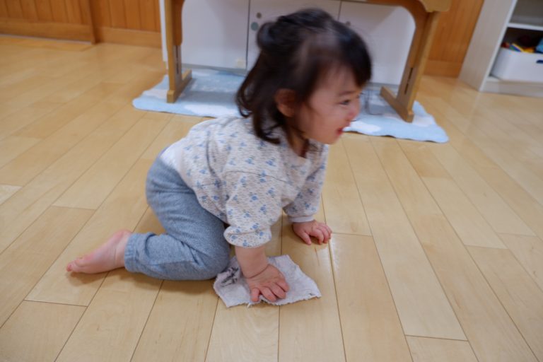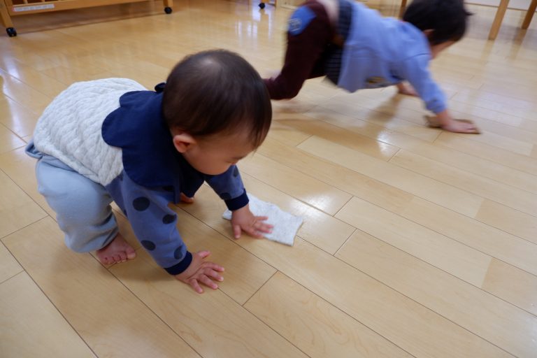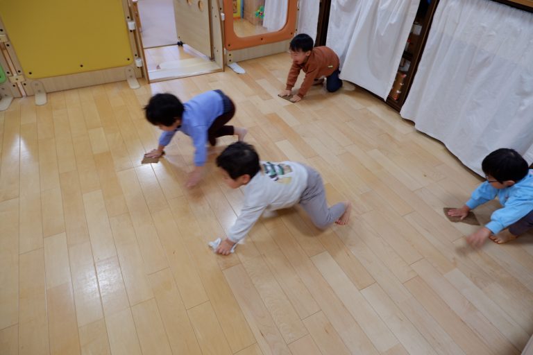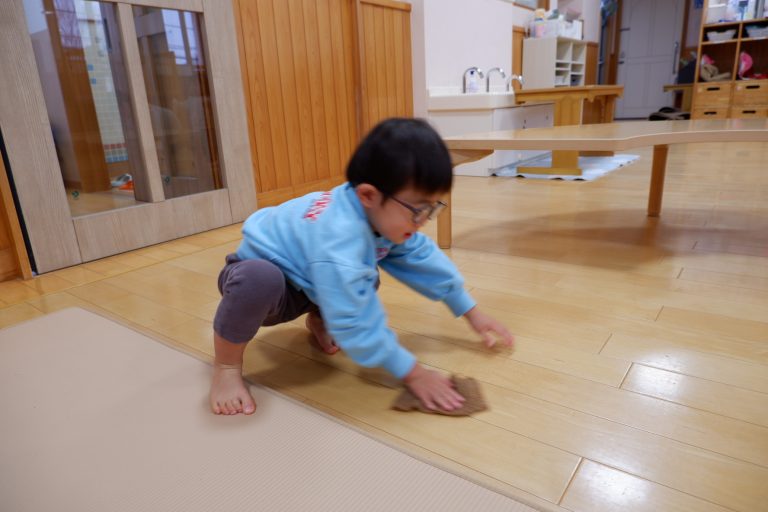 みんなで遊んだお部屋をピカピカにお掃除をしよう、と保育士の声掛けで1人1枚雑巾を受け取りました。