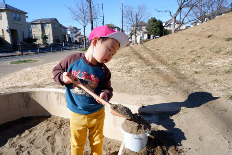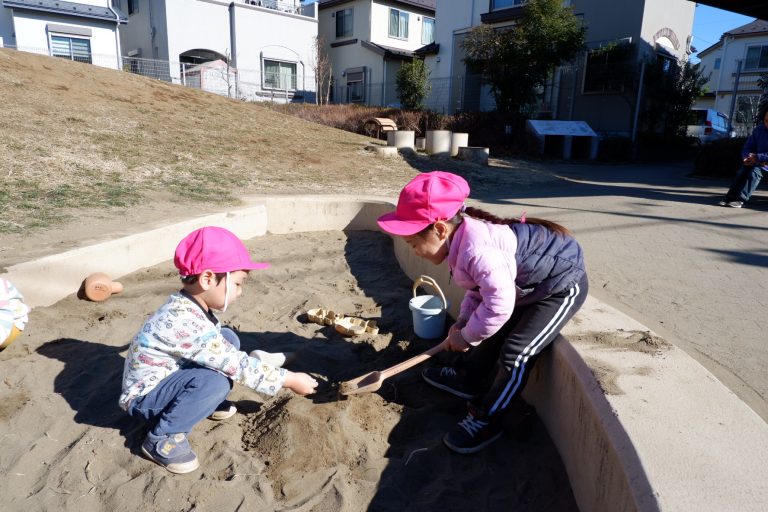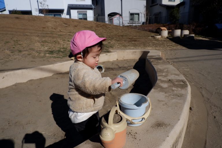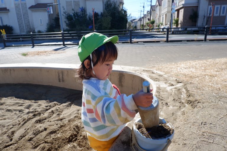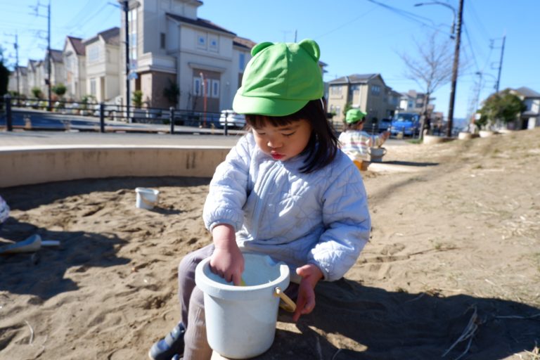 お山を作ったり、お料理作り。ひよこさんは、1、2歳のお友達の様子を見ながら、砂の感触を楽しんでいましたよ。