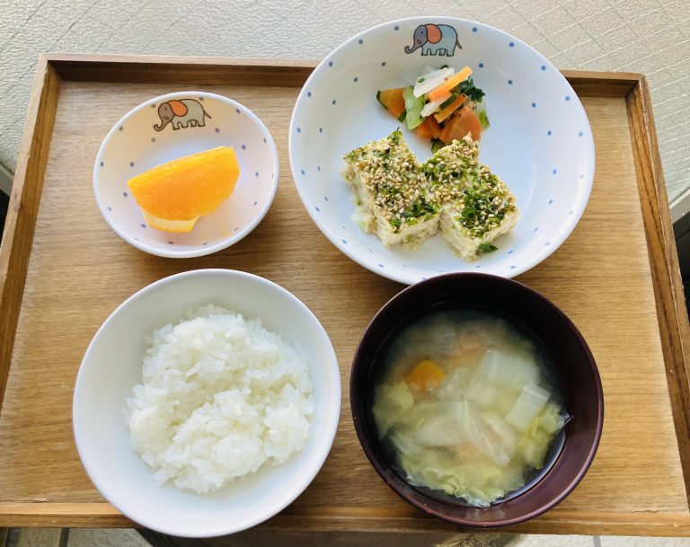 ・プラスご飯・豆腐入り松風焼き・カブの梅和え・味噌汁・オレンジ