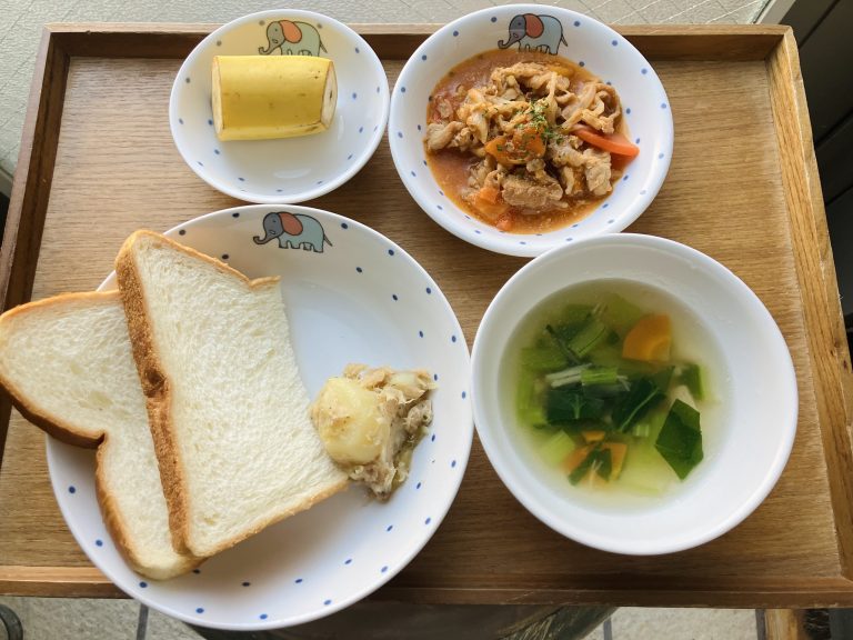 ・食パン・ポークチャップ・リヨネーズポテト・スープ・バナナ