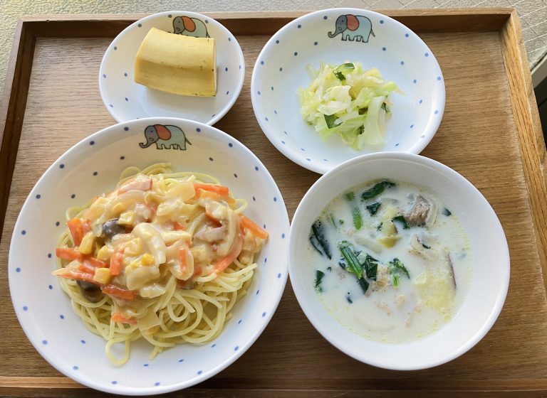 ・コーンクリームスパゲティー・キャベツサラダ・ミルクスープ・バナナ