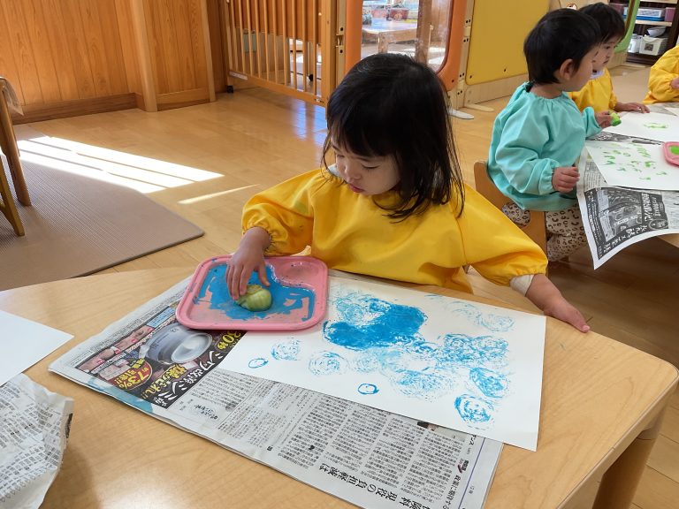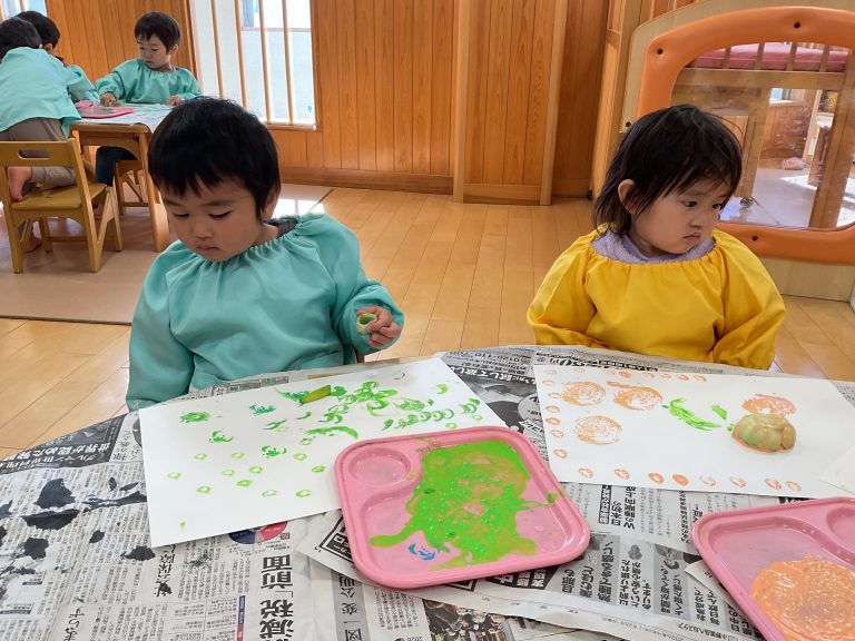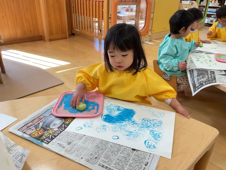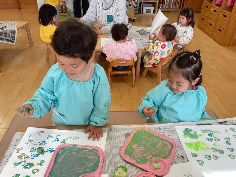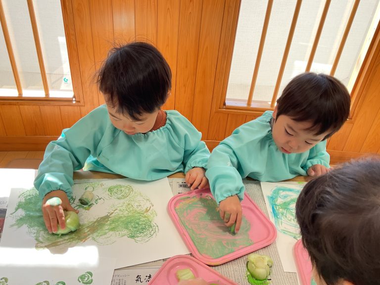 そのあとは、野菜の切り口を使った「野菜スタンプ」を楽しみました。