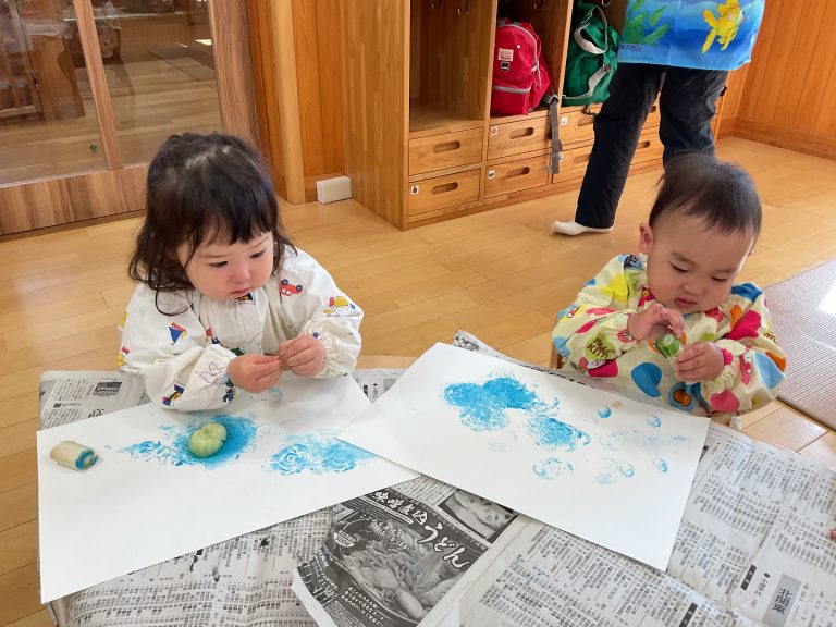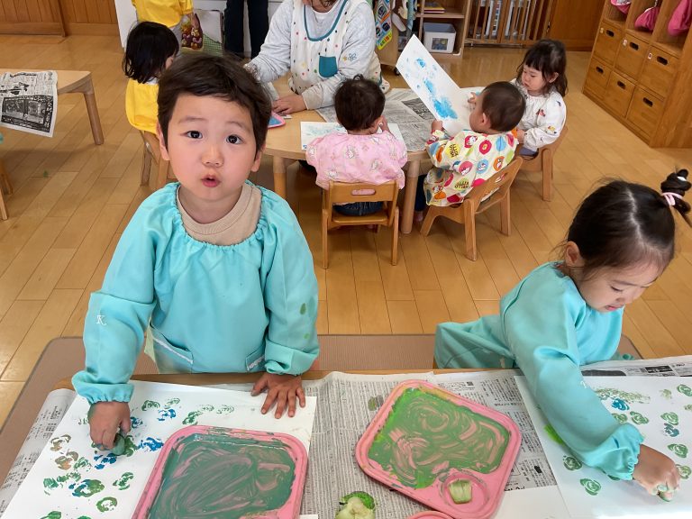 「次は緑!」と夢中になって画用紙いっぱいにスタンプを押していました。