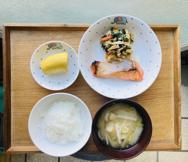 ・ご飯・酒の幽庵焼き・小松菜の炒め煮・味噌汁・バナナ
