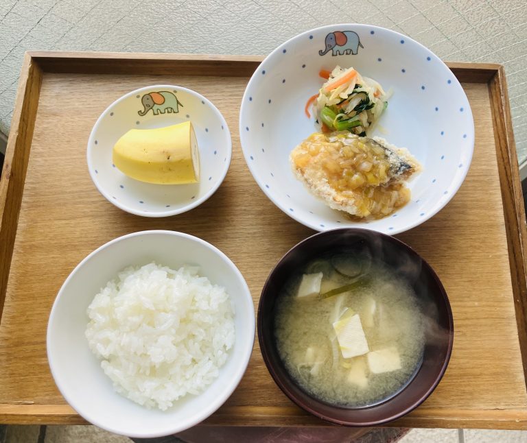 ・プラスご飯・鯖の竜田揚げ ねぎぽんソース・切り干し大根のシャキシャキ和え・味噌汁・バナナ