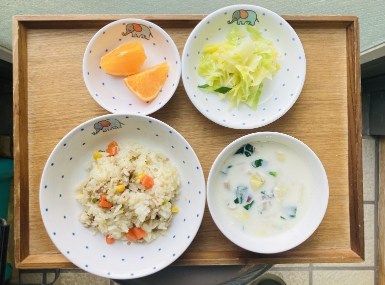 ・カラフルピラフ・キャベツサラダ・ミルクスープ・オレンジ