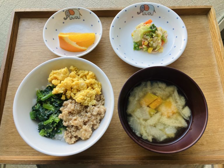・三色丼・白菜のツナサラダ・味噌汁・オレンジ